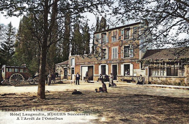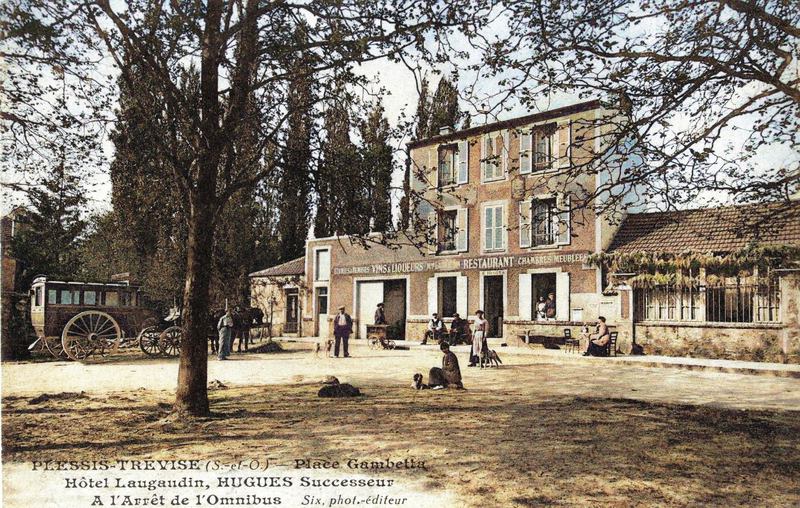 Cette place a longtemps été associée aux familles Laugaudin (tenancier du café-restaurant et agriculteur à la ferme) qui résidait et travaillait en bordure de celle-ci. Or, Louis Nicolas Laugaudin (agriculteur) et sa famille résident jusqu’au moins en 1872 à Croissy-Beaubourg, ce qui est attesté par le recensement de cette date. Ce n’est qu’à partir du recensement de 1876 que le nom de Laugaudin apparait en tant que résidant au hameau de Plessis-Trévise.
