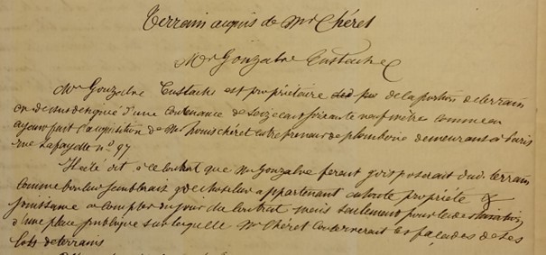 En 1859, Gonzalve Eustache rachète à Louis Chéret, une grande parcelle aux angles arrondis. L'une des conditions émises par Louis Chéret était que celle-ci reste à destination d’une place publique, sans qu’aucun établissement ou industrie insalubre puisse y être installé.