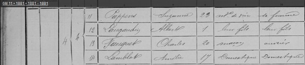 Sur l’acte de décès de Ferdinand Robert, il est mentionné que Catherine, sa femme est marchande de vins. Ce recensement de 1881 apporte un autre élément intéressant dans le fait que Auguste Laugaudin, le fils ainé de Louis Laugaudin agriculteur (témoin du mariage de Catherine This) ne vit plus à la ferme mais avec sa femme Suzanne Pappens qui est déclarée comme marchande de vins.