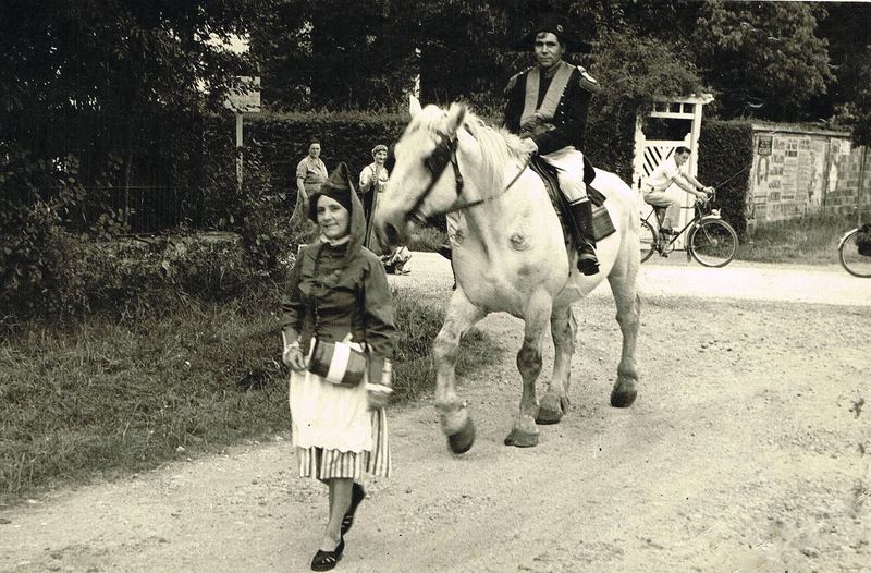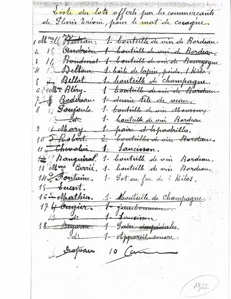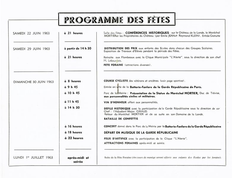 Divers jeux et courses étaient organisés par nos instituteurs : course en sac, à cloche-pied les yeux bandés. La course la plus attendue consistait à passer la ligne d’arrivée avec une brouette occupée par une grenouille qui n’arrêtait pas de sauter ! Chaque concurrent, heureux ou malheureux, recevait du Conseil municipal, des forains ou des commerçants, un lot, à hauteur de ses efforts ou de sa chance ». Elle ajoutait avec humour : Regardez le film de Jacques Tati « Jour de fête », la fête au Plessis, c’était tout à fait ça !