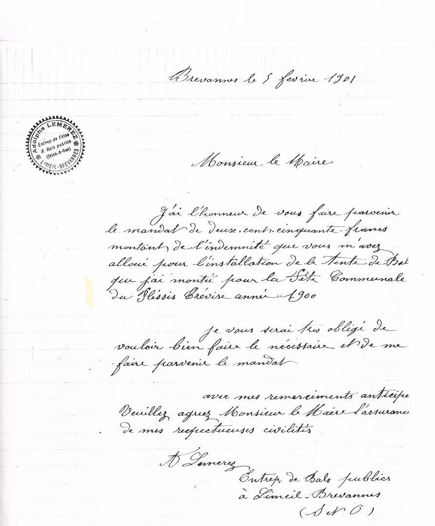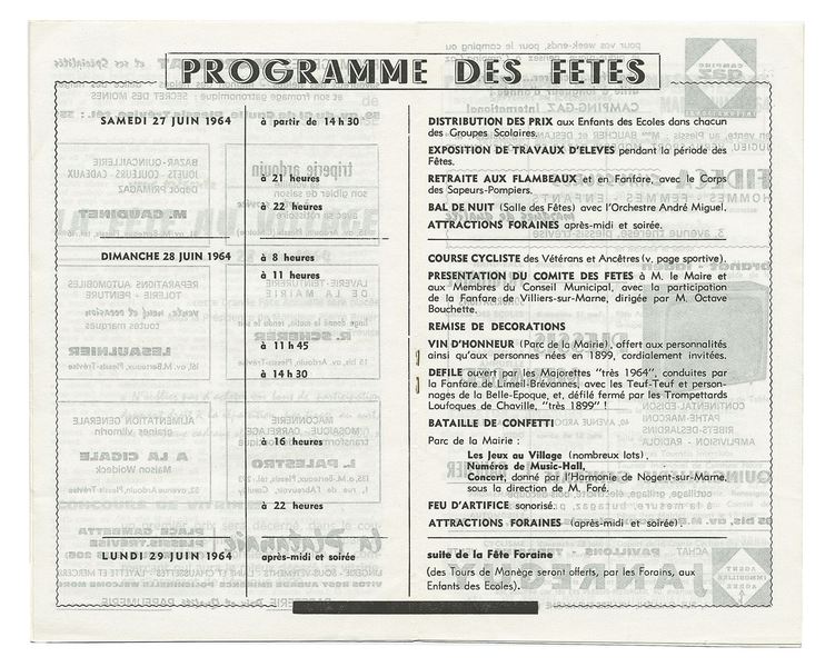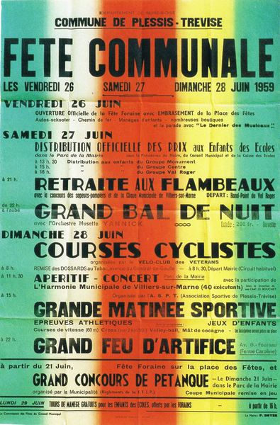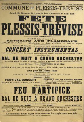Aux prémices de la création de la commune, le 3e week-end de juin, soit les 23 et 24 juin 1900, une fête communale est organisée. Tous les éléments de succès s’y retrouvent : le samedi, retraite aux flambeaux avec salves d’artillerie, illuminations et feux de Bengale, le dimanche, concert instrumental de la fanfare de Plessis-Trévise, bal de nuit avec Grand orchestre (le prix d’entrée est de 1fr50 pour les cavaliers et de 0fr50 pour les dames – Danses sans rétribution). La fête se continue le lundi pour la jeunesse locale, par des courses à pied pour les jeunes gens du pays, des jeux pour les jeunes filles et des chevaux de bois pour les enfants des écoles..