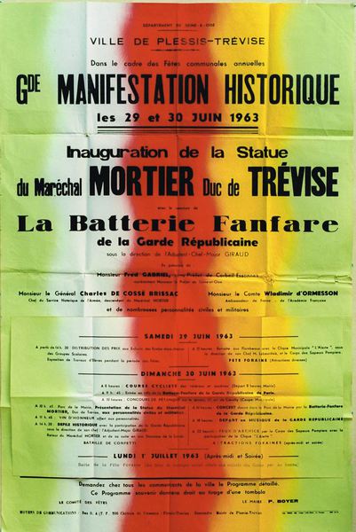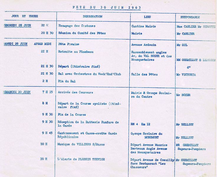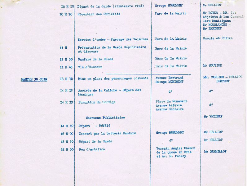 Après avoir assuré l’organisation, en juin 1963, de grandes fêtes historiques pour l’installation de la statue du Maréchal Mortier, dans le parc de la mairie, Jacques Carlier reprendra officiellement le Comité des Fêtes l’année suivante. Son épouse Arlette lui succédera en 1980. Ils auront à cœur de perpétuer, pendant 40 ans, cette traditionnelle fête, réunissant une population chaleureuse autour de défilés de chars rivalisant d’inventivité de la part de nombreux bénévoles plesséens. Bataille de confettis, fanfares et majorettes accompagneront ce défilé.