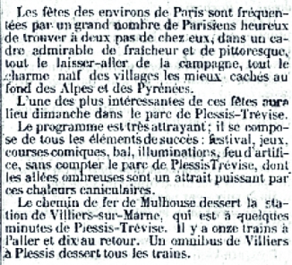 Dès 1858, lors des premiers lotissements, le Parc du Plessis sera animé, au mois de juin, par de grandes fêtes champêtres. Excellente réclame pour les lotisseurs, ces fêtes étaient fréquentées par un grand nombre de parisiens.