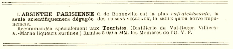 Nous sommes déjà plusieurs, ne pouvant entraver le penchant grandissant de nos contemporains pour « la verte », à prôner du moins la vulgarisation de l’ « absinthe scientifiquement épurée ». Et si ce but est atteint, nous ne regretterons pas notre visite à la Distillerie du Val Roger ...»
