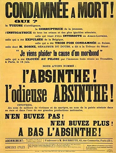 Toutes ces manipulations douteuses amenèrent à appeler l'absinthe "la veuve verte". Ne disait-on pas à l'époque "si vous n'en mouriez pas , vous resterez fou".