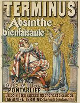 Elle représente devant une bouteille d'absinthe sur laquelle est écrit le mot SANTE, une femme habillée de vert (la couleur de la Fée verte) tenant dans sa main droite un verre et de l'autre celle d'un médecin en tenue du XVIIème.