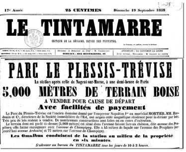 L'affiche ci-contre est parue dans le journal "Le Tintamarre" du 19 septembre 1858. Une grande parcelle (5 000 m²) est à vendre. Elle correspond au terrain sur lequel sera construit le Faisan Doré quelques dizaines d'années plus tard.