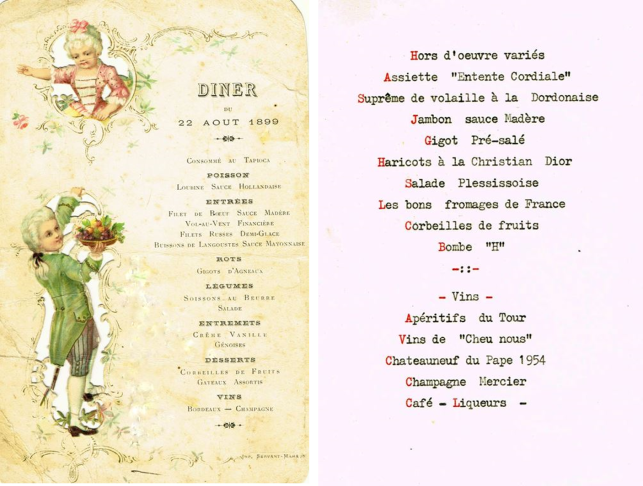 - A droite, un menu daté du 20 juillet 1957 ( à noter : "la salade plessissoise"!).