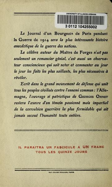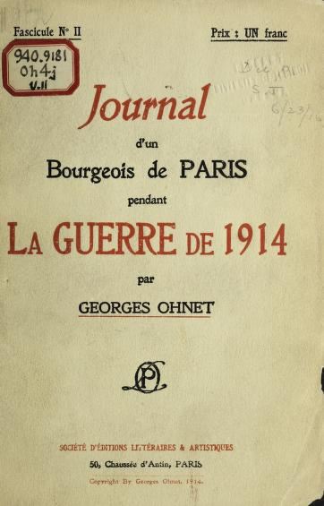 Dans l’un de ses derniers ouvrages : Journal d’un bourgeois de Paris pendant la guerre de 1914, il rend même hommage à la clairvoyance patriotique d’un polémiste fougueux Léon Daudet qui ne l’avait pas littérairement ménagé. Dans ce même journal, Georges Ohnet s’élève, un peu à l’avance, contre le sort que vont sans doute faire subir à sa propriété de Bois-Lacroix, les quelques centaines de terrassiers travaillant à la défense de Paris dont l’arrivée lui est annoncée. Ses craintes ne seront pas, pour cette fois, justifiées.