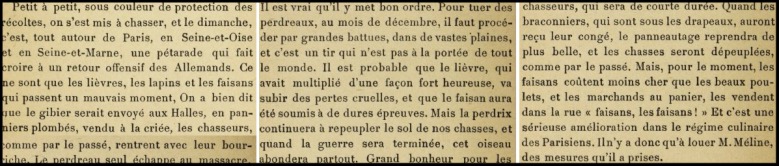 Toujours dans ce même ouvrage, il y commente la chasse dans les bois et terres environnantes : « Petit à petit, sous couleur de protection des récoltes, on s’est mis à chasser, et le dimanche c’est tout autour de Paris, en Seine-et-Oise et en Seine-et-Marne, une pétarade qui fait croire à un retour offensif des Allemands. Ce ne sont que les lièvres, les lapins et les faisans qui passent de mauvais moments… »