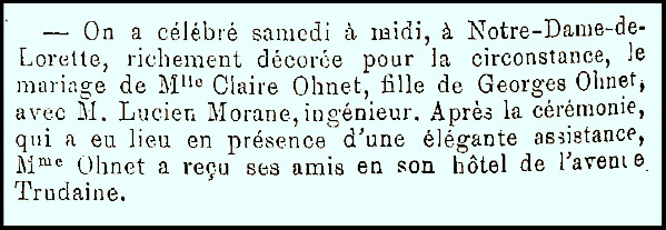 Claire Ohnet est née à Paris en 1881. En 1901, elle épouse Lucien Morane, ingénieur des Arts et Manufactures, gérant de la société de construction mécanique Morane Jeune et Cie. De cette union naitront deux fils : Roger (né en 1902 à Paris) puis Jean (né en 1909 également à Paris).