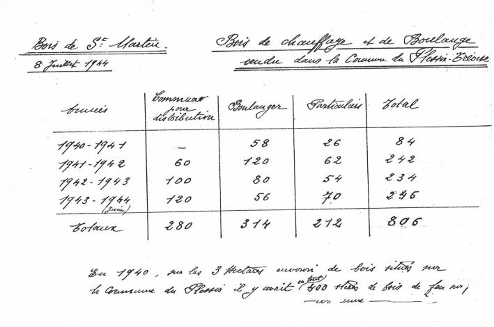 Durant la seconde guerre, le Bois Saint-Martin a constitué une formidable réserve de bois de chauffage pour la commune du Plessis-Trévise. Ci-après, un relevé des ventes effectuées par le baron Charles Petiet de 1940 à 1944. Ce bois était destiné prioritairement aux besoins collectifs et aux plus nécessiteux selon le souhait émis par le baron Petiet.