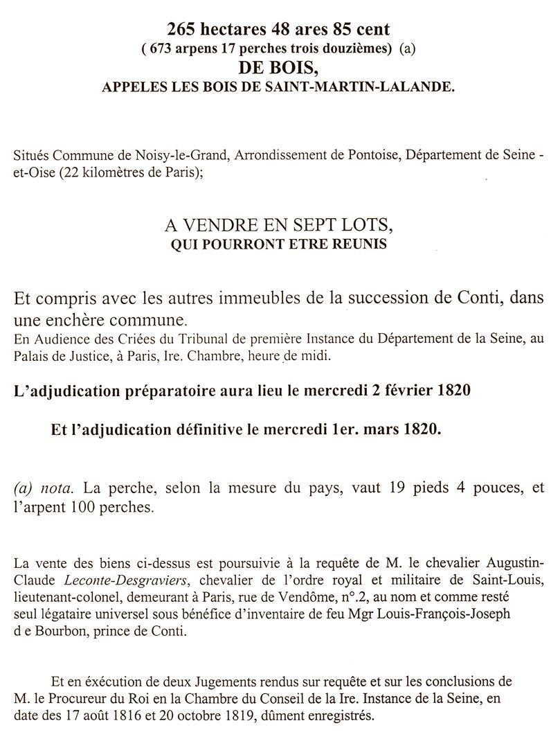 En 1792, Louis François de Bourbon, 7e Prince de Conti, déjà propriétaire des domaines de Lalande et de Saint-Antoine, achète à la marquise de Marbeuf les Bois de Saint-Martin pour la somme de 650 000 livres (Acte Me Guilbert Notaire à Sucy le 9 octobre 1792).