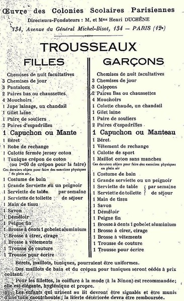 Pourtant dès 1930, soit quand même 30 ans après que la commune a été créée, on relève un courrier de la mairie à l’adresse des parents des futurs colons pour qu’ils autorisent leurs enfants à partir et que ces derniers soient pourvus du trousseau dont le contenu leur a été fourni par ailleurs.