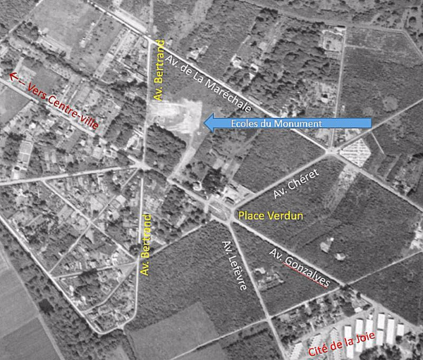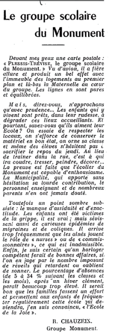 "L'école du quartier du Monument, j'en ai déjà entendu parler lorsque, à la rentrée 1954, les murs de notre école du Centre se sont mis à craquer sous les effectifs et que j'ai dû aller en classe un an dans la salle des Fêtes. Il fallait absolument construire une nouvelle école au Plessis.