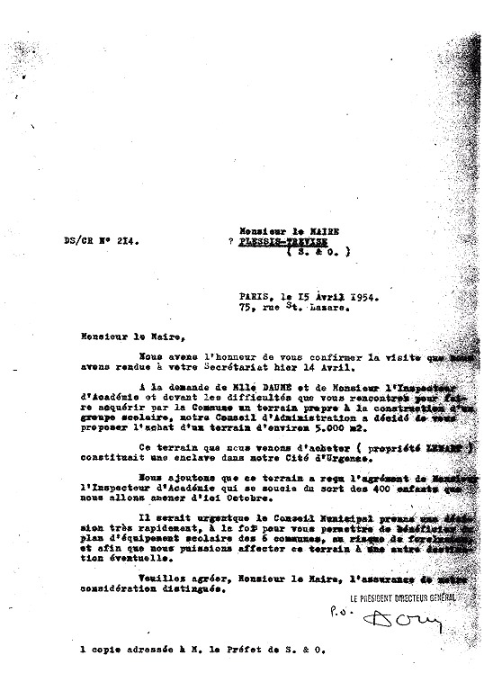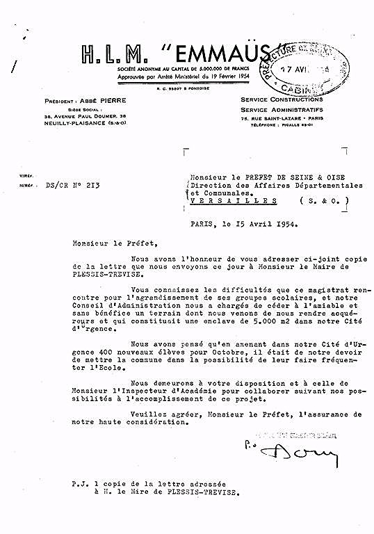 En avril 1954, conscient d'avoir mis en difficulté la commune, l'Abbé Pierre écrit au maire du Plessis-Trévise pour lui proposer la cession à l'amiable d'un terrain de 5 000m² au sein de la Cité de la Joie afin d'y construire une école. L'avenir montrera que cette proposition n'a pas été retenue.