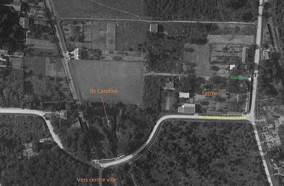 Nul doute qu’il s’agit là de la parcelle qui contenait l’Ile Caroline sur laquelle a été construite, en 1967, la résidence éponyme. Ne lit-on pas d’ailleurs « qu’elle est traversée aux deux tiers de sa longueur par une plantation d’ormes de forme octogone au milieu de laquelle est une pièce d’eau de même figure ».