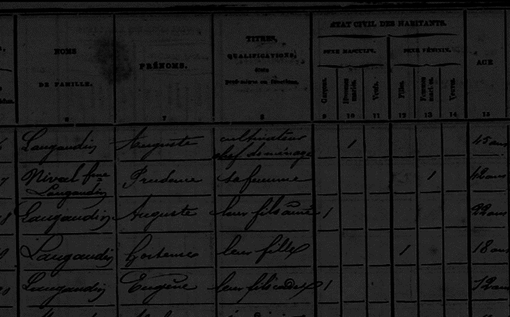 Auguste, cultivateur est alors agé de 45 ans et Prudence de 42 ans. Ils ont trois enfants (Auguste 22 ans, Constance 18 ans et Eugène 12 ans).