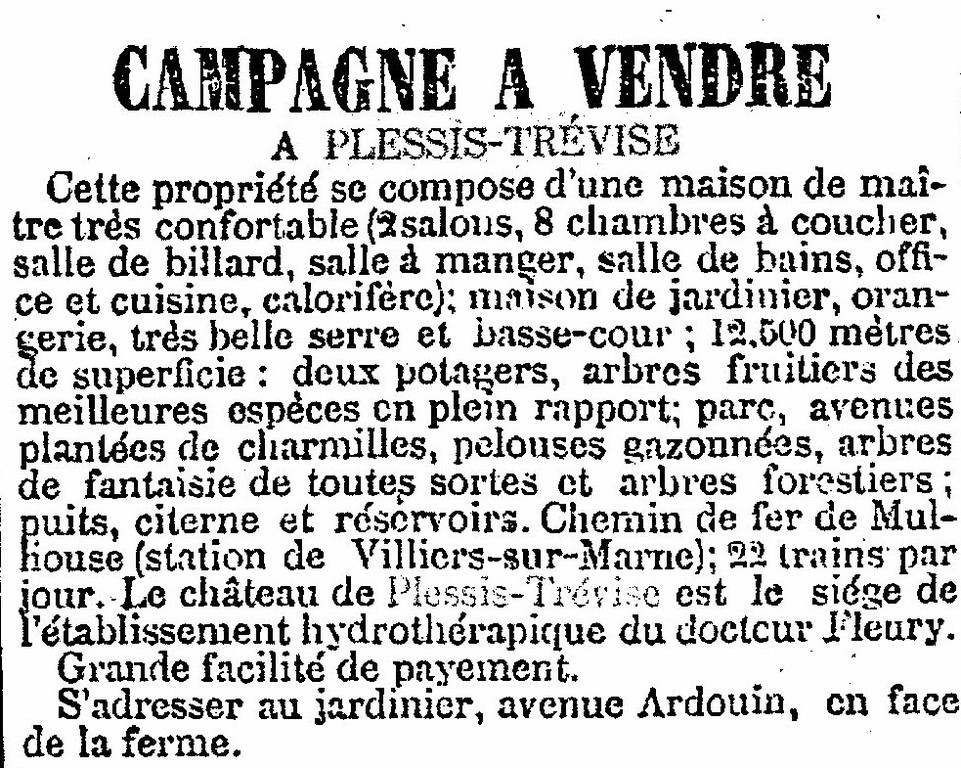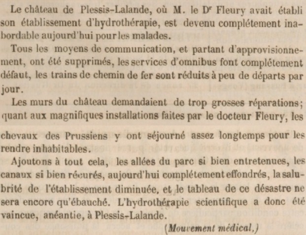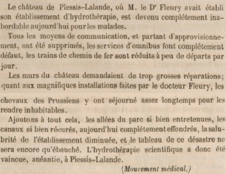 Nous croyons que l'établissement de Plessis-Lalande est précisément le lieu où se trouvent réunies toutes ces conditions, et nous espérons que M. Fleury ne faillira pas à une tâche dont le public médical attend de lui l'accomplissement."