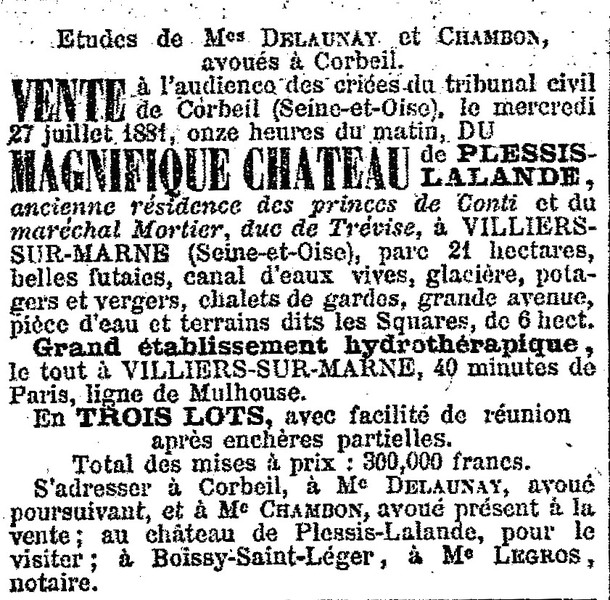 résidence des princes de Conti et du duc de Trévise, est unique en Europe pour la beauté et la salubrité de ses conditions topographiques. Le beau château de Plessis-Lalande, situé sur un plateau élevé de 106 mètres au-dessus du niveau de la mer, domine la vallée de la Marne ; il est largement aéré, bien qu'il soit entouré de bois admirablement disposés pour la promenade à pied, en voiture et à cheval. Du côté du nord et du nord-est, il est abrité par un parc de 80 arpents, enclos de murs, présentant de magnifiques ombrages séculaires et sillonné par des eaux vives.