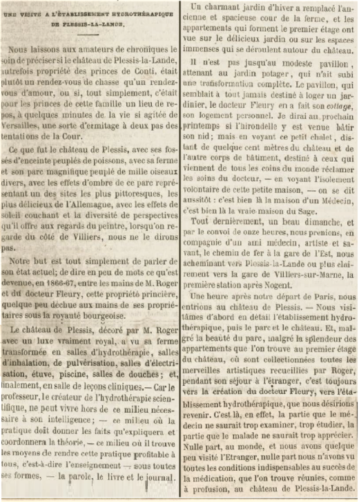 Le Docteur Auburtin a suivi de près les travaux menés par le Docteur Fleury sur l'hydrothérapie. Il livre dans un article paru dans la Réforme Médicale (n° du 5 mai 1867) un témoignage très intéressant non seulement sur les installations de l'Institut Hydrothérapique du Plessis-LaLande mais aussi sur les bienfaits des traitements effectués tout en n'oubliant pas de décrire la qualité du site.