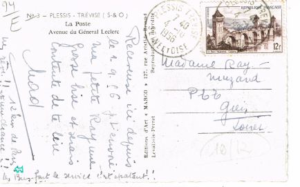 Toutefois, la receveuse semblait satisfaite de sa situation le 4 octobre 1956, selon la correspondance de la carte postale ci-dessous qui mentionne : "Receveuse ici depuis le 1.9.56 ... 12 km de Paris un rêve !! et une chance !! les bus font le service, c'est épatant !! "