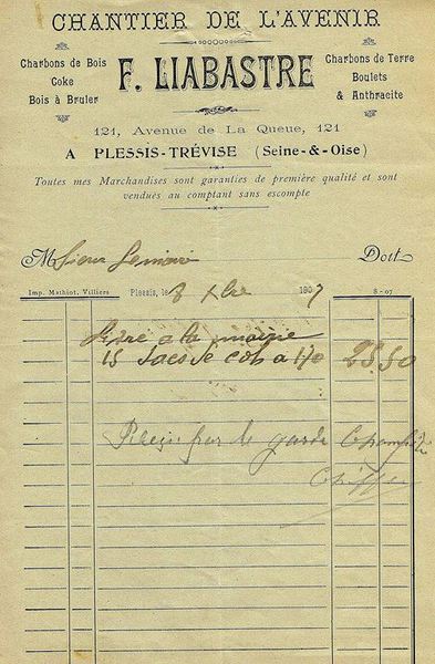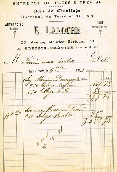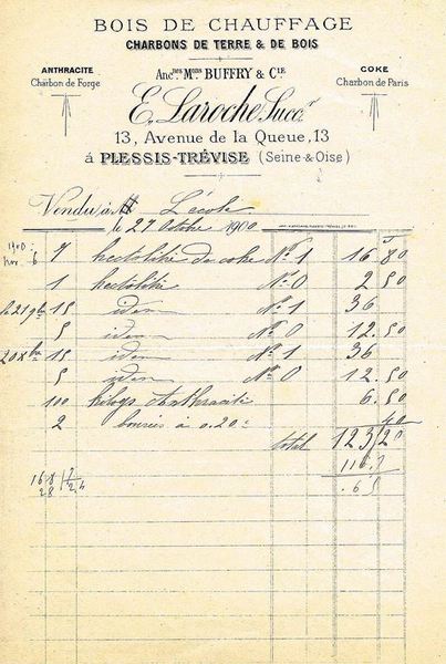 Au Plessis-Trévise, en août 1900, Ernest Laroche, prend la succession de Eloi Buffry (ou Buffery), marchand de bois de chauffage, de charbons de terre et de bois.