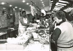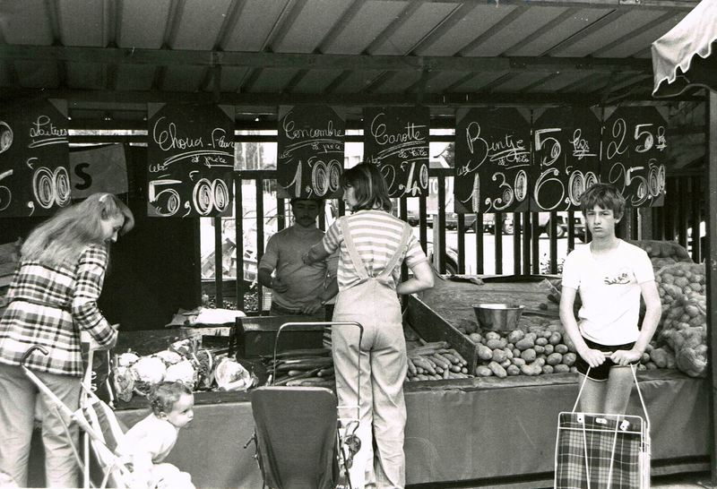 « 2 fois par semaine, le mercredi et le samedi, a lieu le marché. Avant la guerre, il se tenait Place des Fêtes. On y voyait deux crémiers, un épicier, un poissonnier, un boucher, un boucher chevalin, un marchand de légumes, un charcutier, une mercière. Maintenant, aux mêmes jours qu’avant, il a lieu dans un garage, avenue Ardouin, près de la mairie. Il y a deux crémiers, un boucher, trois marchands de légumes, une mercière, un épicier ».