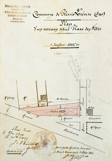A cette époque, Alexis Quirin, maire de Villiers-sur-Marne, est propriétaire de l’importante Manufacture de Faux-cols et manchettes, située au hameau, avenue Ardouin (quasiment à hauteur de la médiathèque actuelle). Le 28 août 1891, il acquiert à titre personnel, une portion de terrain de près de 1300 m2 adjacente à son entreprise, dans le but d’en faire donation à la future commune du Plessis-Trévise. En contrepartie, cette dernière devra s’engager à affecter à perpétuité ledit terrain à usage de place publique. En 1904, cette donation est officialisée par acte notarié et délibération du Conseil municipal de la toute jeune commune.