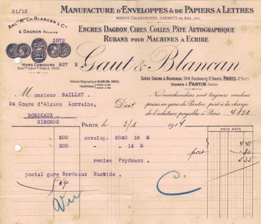 En octobre 1903, le Bulletin général de la Papeterie annonce que "Charles Blancan se retire laissant la suite de ses affaires à ses fils et à son gendre (Albert Gaut) auxquels il cède tous ses droits dans la société. La raison sociale devient Gaut et Blancan, son siège est toujours à Paris, 126 faubourg Saint Denis. La manufacture d'enveloppes reste également à Pantin".