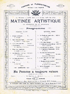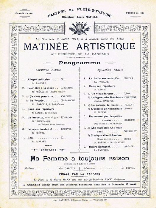 Ainsi, le 2 juillet 1911, une matinée artistique, au bénéfice de la fanfare, est organisée dans la salle des fêtes tout nouvellement inaugurée. Un allegro militaire ouvre solennellement le programme, diverses scénettes théâtrales se succèdent, avant que la fanfare interprète plus légèrement à l’entracte et à la clôture, un boléro espagnol.