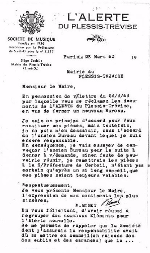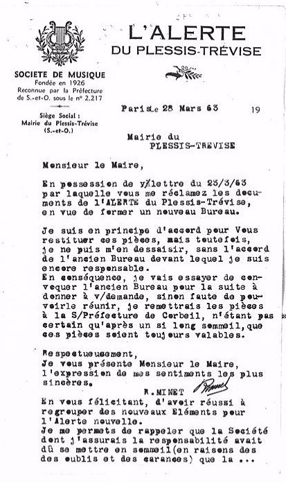 Cependant, cette fanfare connaitra bien des soubresauts administratifs. En effet, si une nouvelle association portant le nom de « L’Alerte du Plessis-Trévise » est fondée en 1926, elle est déclarée dissoute le 30 novembre 1928 !