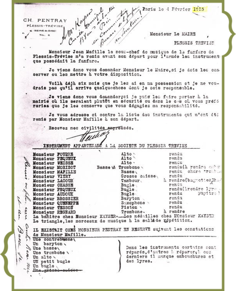 Le 4 février 1915, Charles Pentray, chez qui sont entreposés habituellement les instruments de musique, avise le maire du Plessis que Jean Mafille étant mobilisé depuis 6 mois, la fanfare est en suspens.