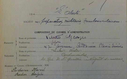 Le 24 avril 1921, « L’Alerte » est officiellement déclarée au Journal Officiel, sous la direction de Georges Vilette. Elle est alors constituée de 53 membres honoraires, 19 membres actifs et 6 pupilles.