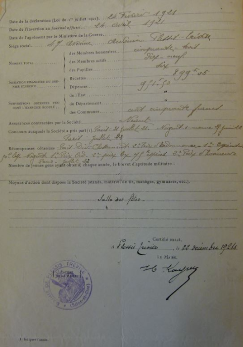 Le 12 octobre 1915, la Fanfare reçoit un agrément du Ministère de la Guerre en tant que « Société de préparation militaire ». N° agrément : 7227