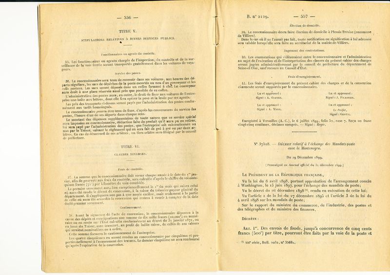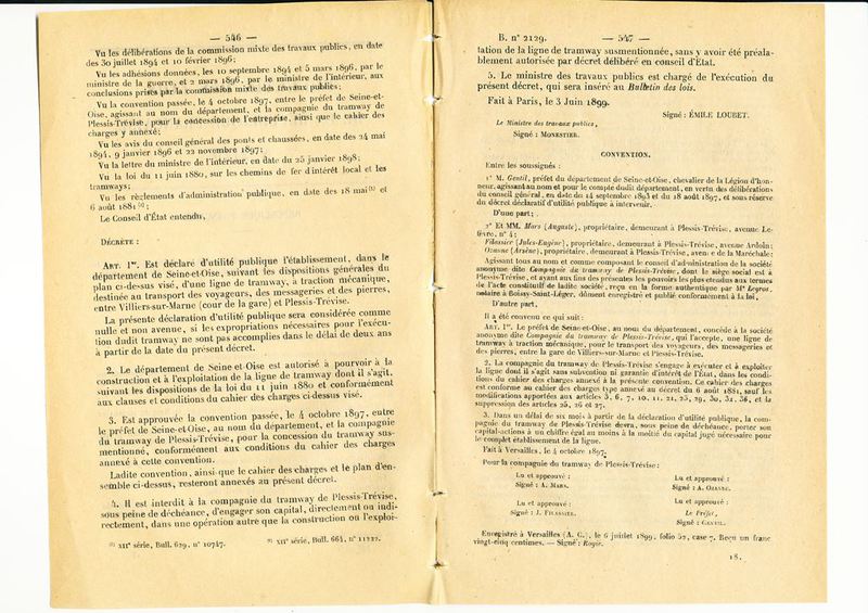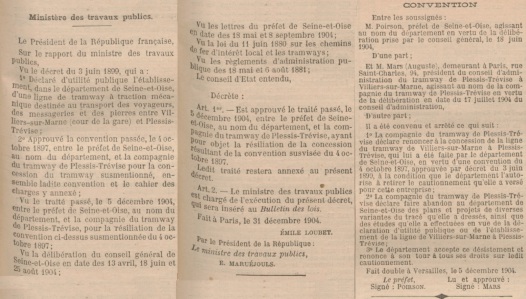 Le cahier des charges est enregistré à la préfecture de Seine-et-Oise à Versailles le 6 juillet 1899 presque conjointement au décret du 7 juillet 1899, portant création de la commune du Plessis-Trévise.