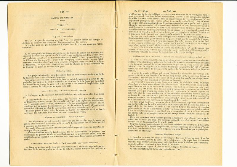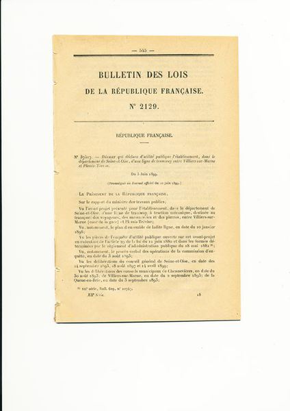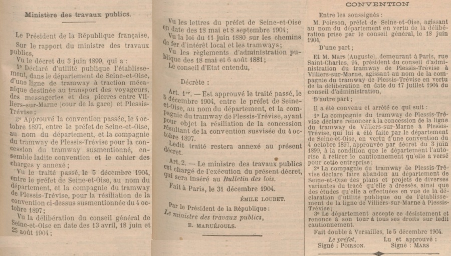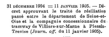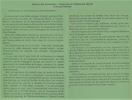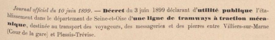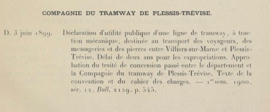 [Délibération du Conseil Général – séance du jeudi 14 septembre 1893] : « M. Le Préfet est autorisé à signer le projet de convention portant concession à la Société Anonyme dite « Compagnie du Tramway de Plessis-Trévise » d’une ligne de tramway à traction mécanique pour le transport des voyageurs, des messageries et des pierres entre la gare de Villiers-sur-Marne et Plessis-Trévise, conformément au projet soumis aux enquêtes, sans modification et sans subvention ni garantie d’intérêt ».