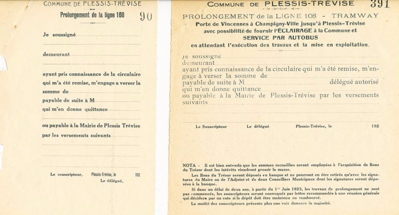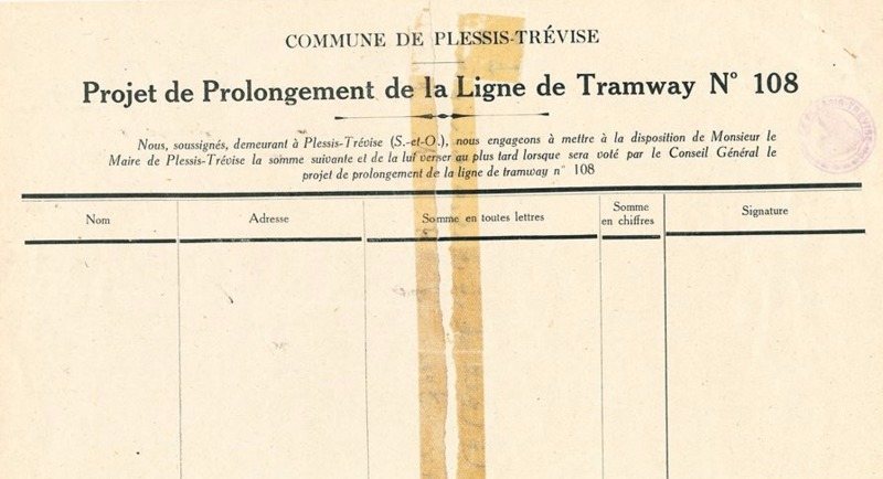 habitants de la commune. Le maire du Plessis-Trévise fait dès lors appel à la générosité de ses administrés pour construire la ligne de tramways, projet présentant d'autant plus d'intérêt qu'il est