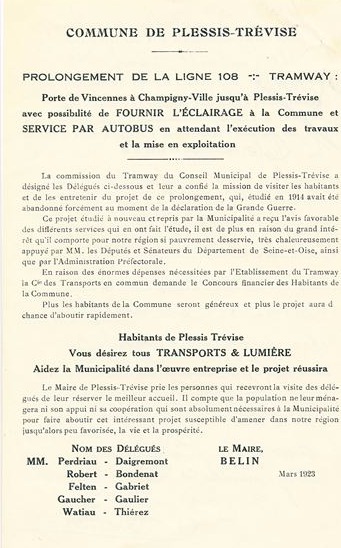 La Grande Guerre achevée, la municipalité du Plessis-Trévise conduite par Joseph Belin, reprend le projet. Il s’agit alors, à nouveau, de prolonger la ligne 108 de tramway "Porte de Vincennes à Champigny-ville" jusqu'à Plessis-Trévise. Cette démarche est fortement encouragée par les députés et sénateurs de Seine-et-Oise ainsi que par l’administration préfectorale " en raison du grand intérêt que le projet comporte pour notre région si pauvrement desservie".