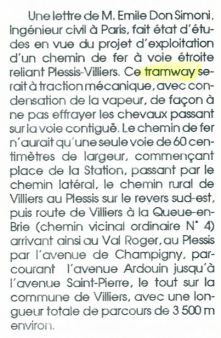 Le Conseil municipal de La Queue en Brie, réuni en session le 18 mai 1891, très intéressé par la prolongement de la ligne de tramways jusqu'à leur commune, donne à l’unanimité un avis favorable au courrier, au motif que « l’établissement d’un tramway allant du Plessis-Trévise à Villiers-sur-Marne ne peut que faciliter l’accès à notre localité et par suite en assurer le développement et la prospérité».
