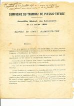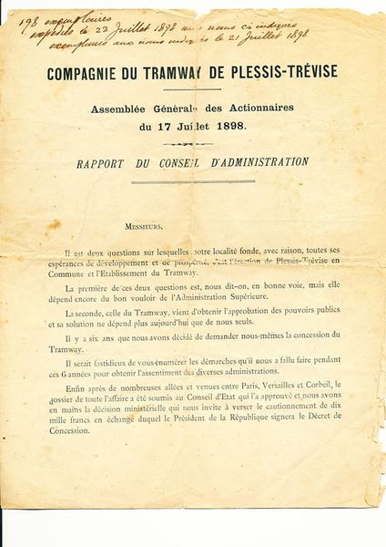 Le 17 juillet 1898 a lieu l' Assemblée Générale des Actionnaires de la Compagnie du Tramway de Plessis-Trévise. Selon l'extrait ci-dessous, le rapport du Conseil d' Administration expose les faits suivants :