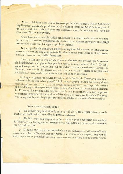 2) de faire appel aux propriétaires des terrains appelés à bénéficier de la création du tramway en les engageant à souscrire ces 1450 actions à raisons de cinq centimes par mètre de terrain ….>>