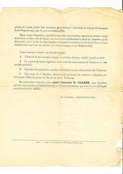 Notre capital initial était de 5 000 francs, qui ont été souscrits et intégralement versés, et qui ont été employés en frais d’études et autres frais absolument nécessaires. Il est certain que la création du tramway donnera aux terrains, dès l’ouverture de l’exploitation, une plus-value que l’on peut, sans exagération, évaluer à 50 centimes ou un franc par mètre, de sorte que tout propriétaire, devenu souscripteur d’actions du tramway, sera certain de gagner, au moins sur ses terrains, même si l’exploitation du tramway reste pendant quelques années sans donner de revenu. Ainsi, si chaque propriétaire souscrit des actions proportionnellement à la superficie de sa propriété, le tramway pourra fonctionner dans quelques mois et cela, sans que le montant des actions à souscrire par chacun dépasse la somme minime de 5 centimes par mètre des propriétés bénéficiant directement de la création du tramway. La somme ainsi réalisée ajoutée aux subventions que nous espérons recevoir des communes et des services publics intéressés, permettra d’établir le tramway avec toute la solidité et le confortable nécessaires.