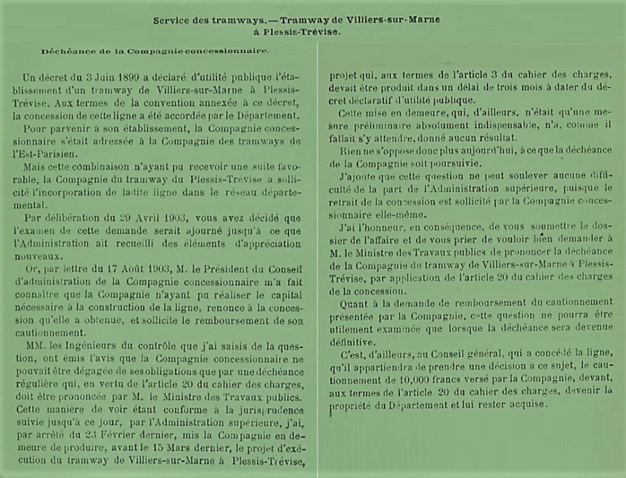 Le 23 février 1904, la Compagnie est sommée de produire, pour le 15 mars, le projet d’exécution de la ligne de tramways de Villiers-sur-Marne à Plessis-Trévise. Rappelons, au passage, que ce projet devait déjà être présenté dans les 3 mois suivant le décret d’utilité publique du 3 juin 1899. Le projet ne fut jamais présenté.