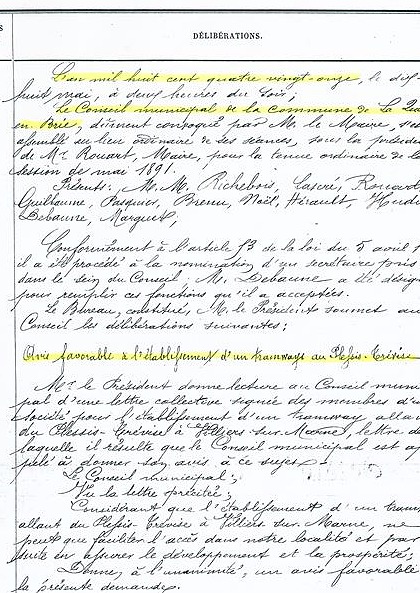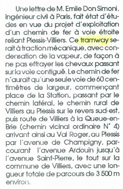 Le 30 août 1893, le Conseil municipal de la commune de Chennevières-sur-Marne formule son avis sur les tracés proposés par la Compagnie du Tramway, en retenant un tracé passant sur le secteur de Chennevières, le plus proche du Plessis, qui comptait alors près de 200 habitants. Ce n’était donc, certes pas, le chemin le plus court qui était retenu mais celui desservant un maximum d’habitants.