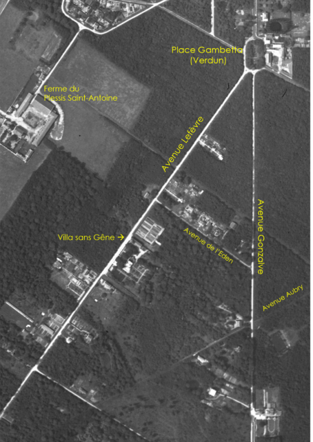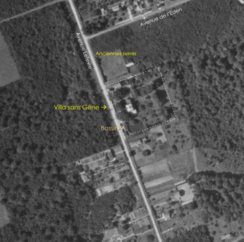 Sur ce cliché aérien de 1933, la Villa Sans Gêne apparait encore relativement isolée, entourée de bois. Quelques constructions sont édifiées un peu plus loin dans l'avenue Lefevre. Plusieurs constructions sont aussi présentes dans l'avenue de l'Eden.