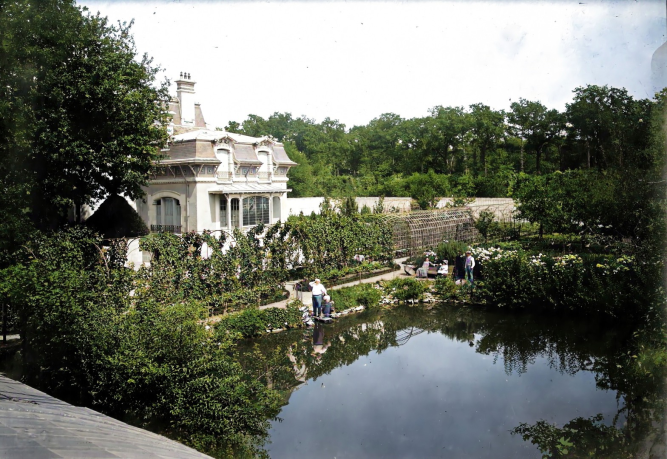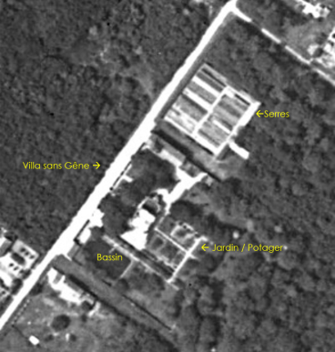 En regardant attentivement, il est possible de discerner dans les bois le chemin qui rejoint le carrefour des avenues Gonzalve et Aubry. Chemin qui passait alors entre le bâtiment en meulière et les serres (cf. vue agrandie).