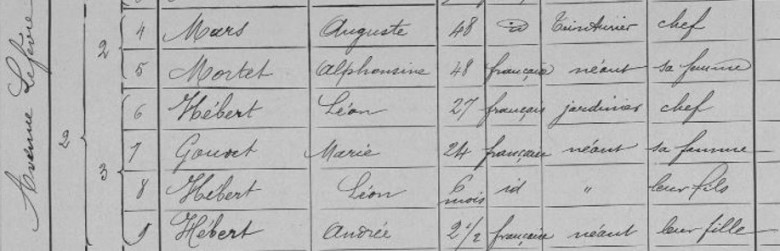 Auguste MARS est très occupé sur Paris et échappe ainsi aux différents recensements de population sauf à celui de 1896, ce qui permet de constater l'emploi d'un jardinier, logeant sur place en compagnie de sa famille :