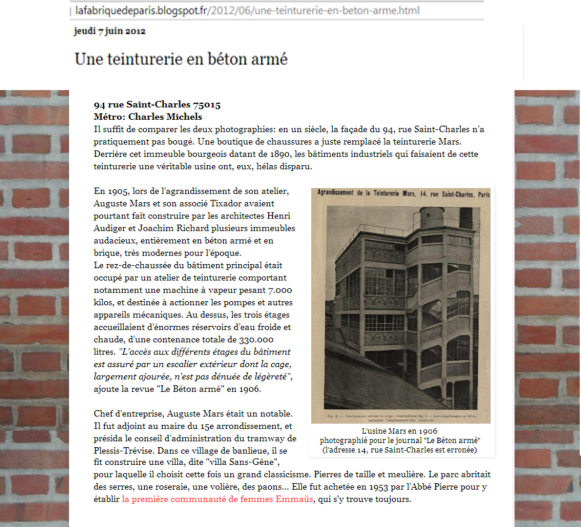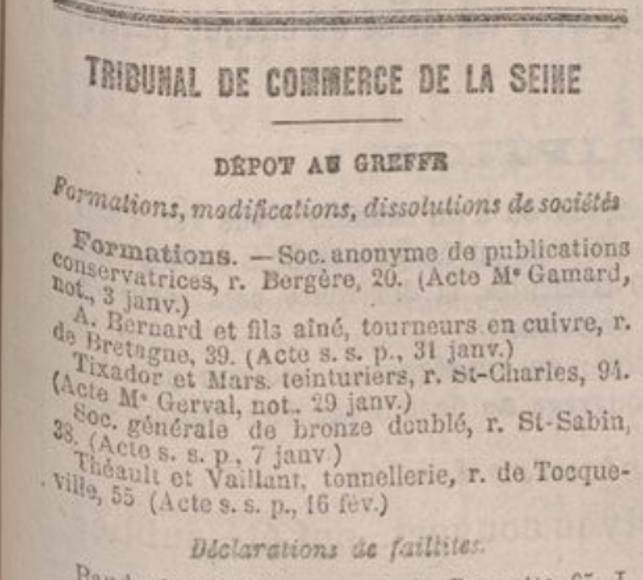 Cette société figure dans le Journal Officiel du 24 février 1879 déposé au greffe du Tribunal de Commerce du département de la Seine. Il s'agit d'une société de teinturerie située au 94, de la rue Saint-Charles à Paris.