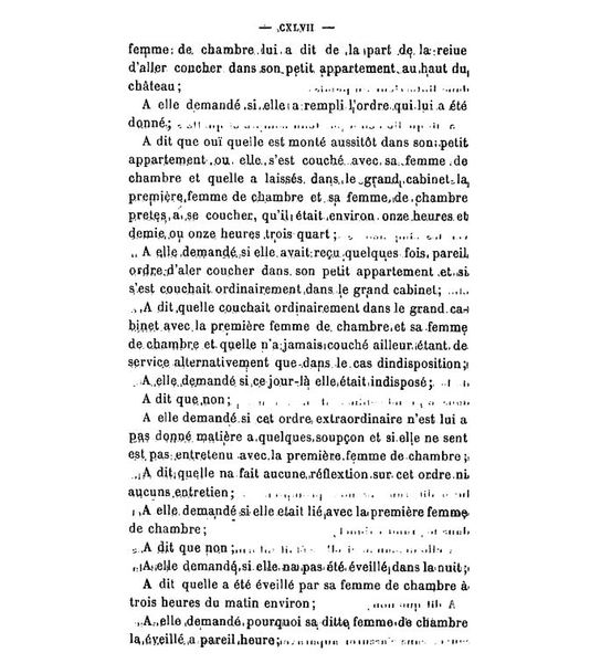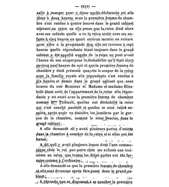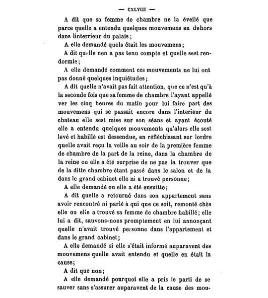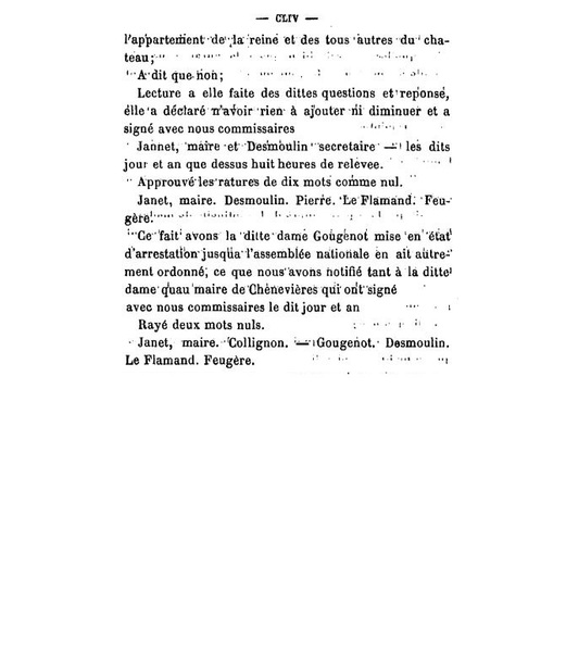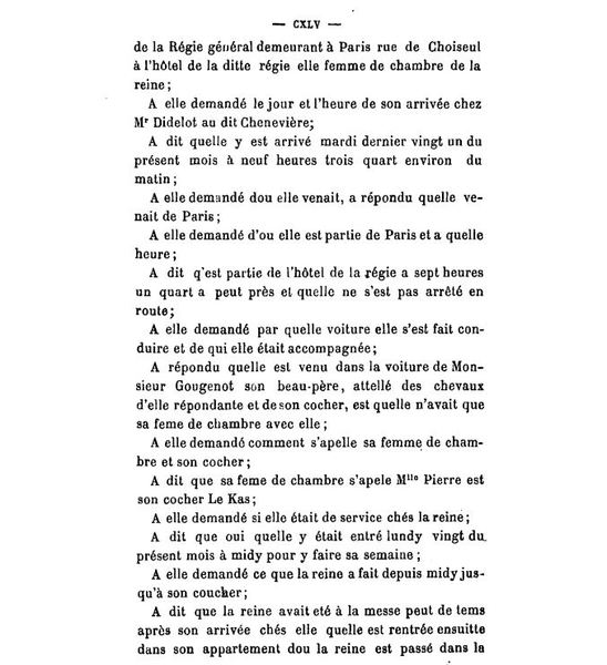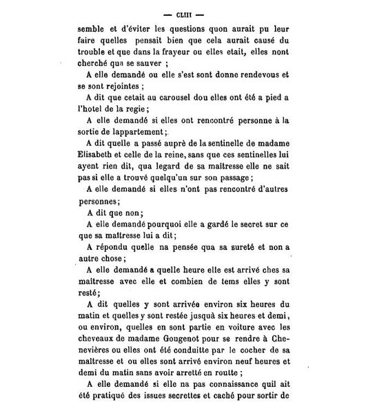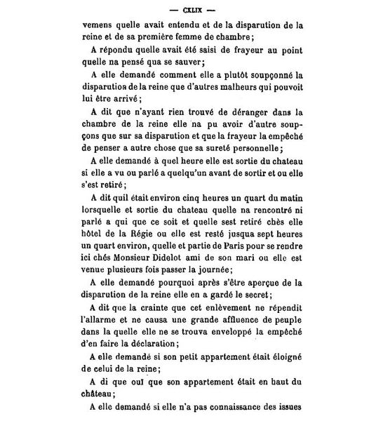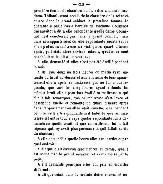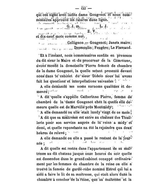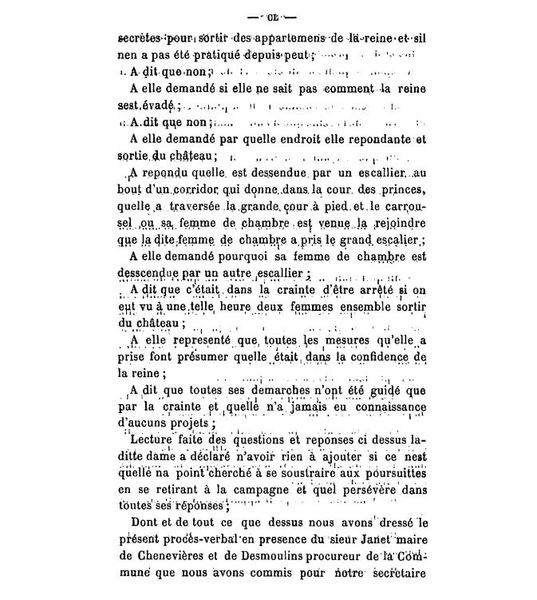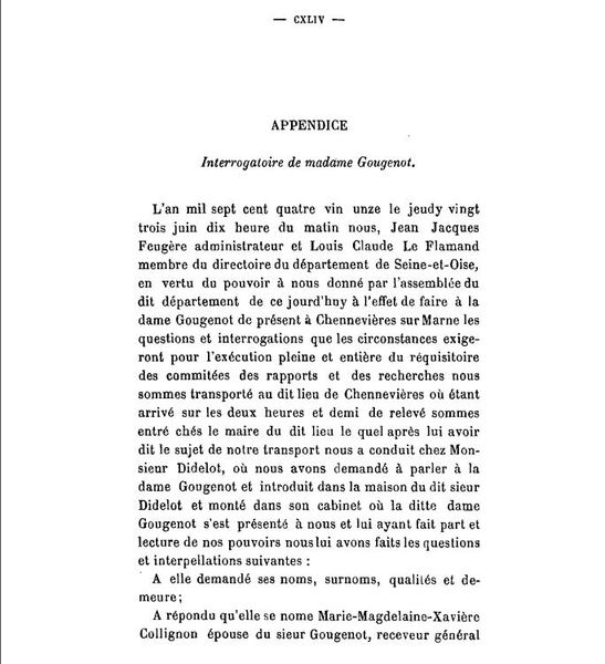 "La dame Gougenot interrogée répond qu'elle ne sait rien. Elle s'est couchée comme à l'ordinaire. Vers 3 heures du matin sa femme de chambre lui dit qu'il se faisait du mouvement, elle n'en tint pas compte et s'endormit. Et sur les 5 heures du matin, sa femme de chambre l'a réveillée pour la seconde fois. Elle se leva alors, alla à la chambre de la reine, qu'elle trouva vide. Effrayée par les suites de ce départ, elle sortit du château pour se rendre chez elle, fit mettre les chevaux à sa voiture pour se rendre à Chennevières chez Madame Didelot. "